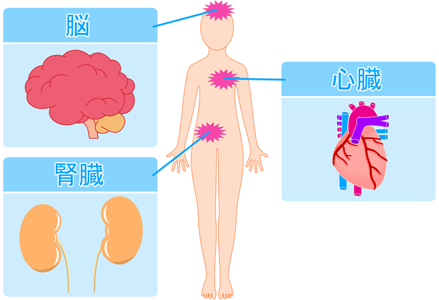 血圧が高い状態が慢性的に続いていると動脈硬化(血管が硬くなること)が進み、以下のような命に関わる重大な合併症を引き起こすことがあります。