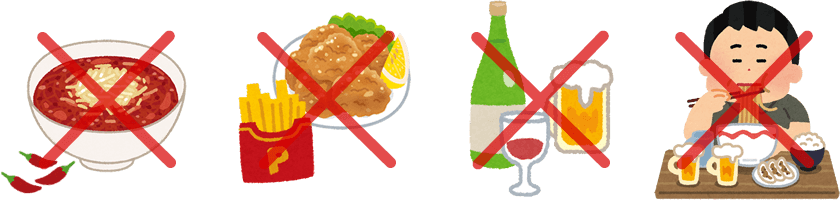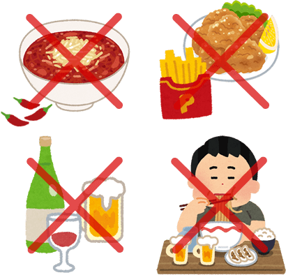 生活習慣で気を付ける事としては香辛料や油ものを控えめにする、暴飲暴食、アルコール類の過剰摂取は控えて、消化の良い食事を適量食べるように心掛けて下さい。