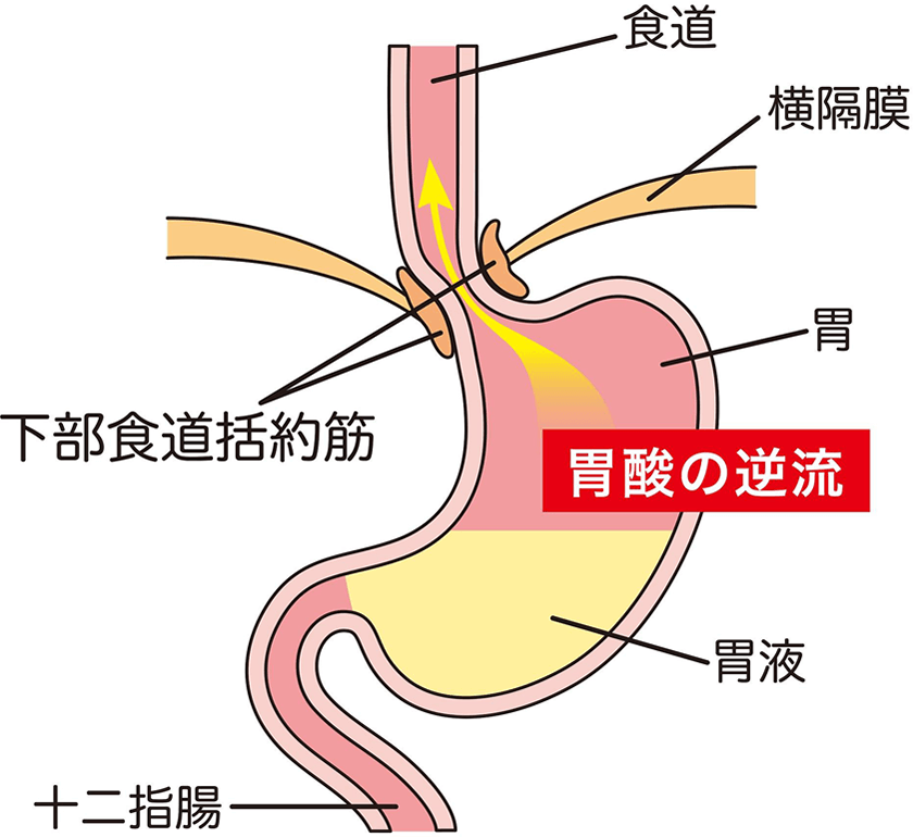 加齢に伴い下部食道括約筋が緩む方や食道裂孔ヘルニアというような本来あるべき位置から食道胃接合部がずれて胃酸が逆流しやすい状態となる方がおられ、胃に圧力がかかるような前かがみの姿勢を取ったり、食後に直ぐに横になると、胃酸が食道内へ逆流する事があります。