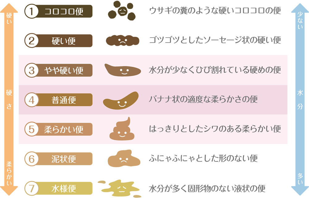 人によって便の形状や便の状態を表現するのも異なりますので、このスケールを活用すると客観的に判断ができます。