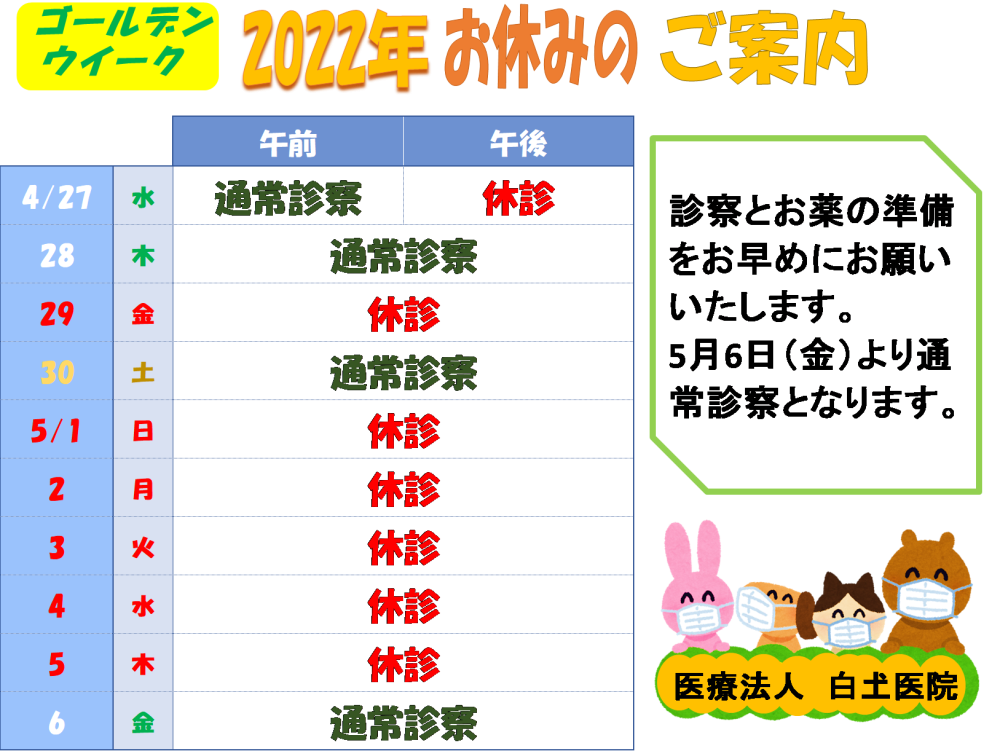 令和4年ゴールデンウイーク休診のお知らせ